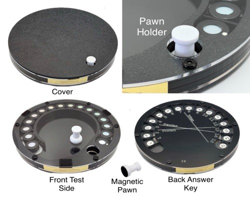 A convenient snap-on cover protects the discs from fading due to sunlight and ambient light. The kit includes a magnetic felt tipped stylus/pawn, score sheet, and a pair of “C” daylight glasses. These glasses have special filters which transform normal incandescent light to “Illuminant C” type illumination, the proper light setting for the administration of color tests.